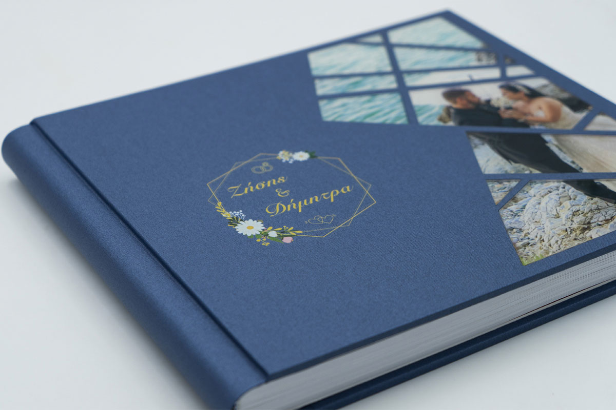 Άλμπουμ γάμου σε διάσταση 30×40 με φωτογραφία τυπωμένη σε plexiglass κομμάτια σε ένα γεωμετρικό σχέδιο. Υπάρχει και η δυνατότητα uv εκτύπωσης στην δερματίνη το όνομα και η ημερομηνία.