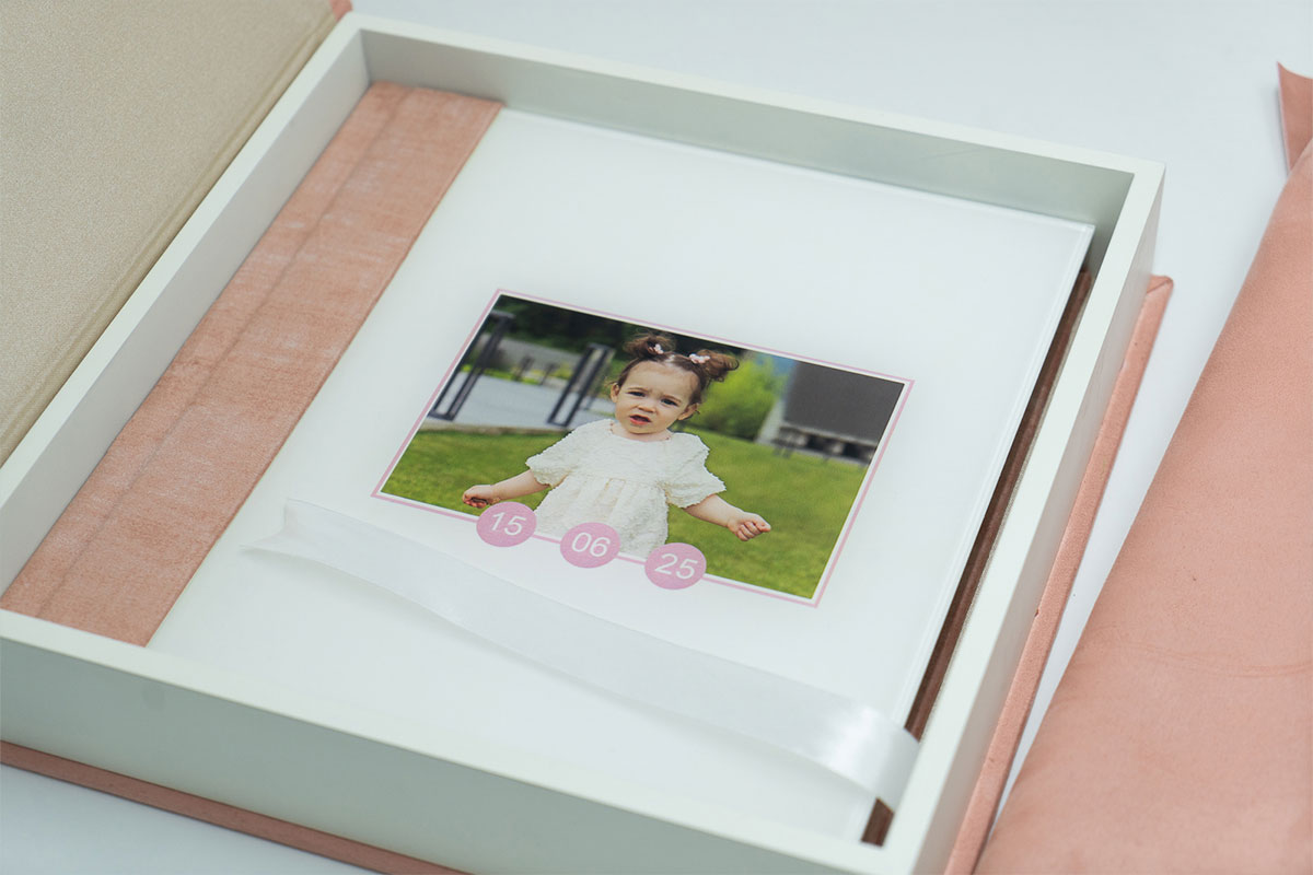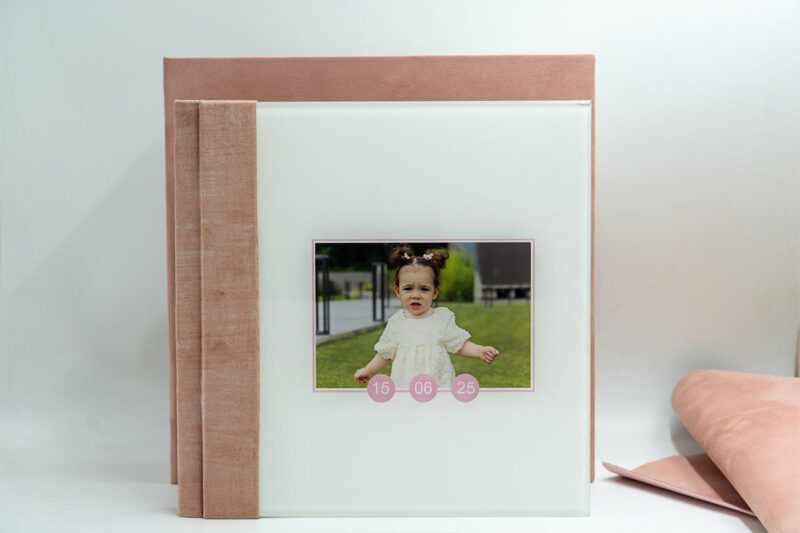 Άλμπουμ βάπτισης σε διάσταση 30*30 με εκτύπωση uv σε plexiglass το γραφικό της επιλογής σας και βελούδο στο πίσω μέρος του εξωφύλλου.