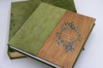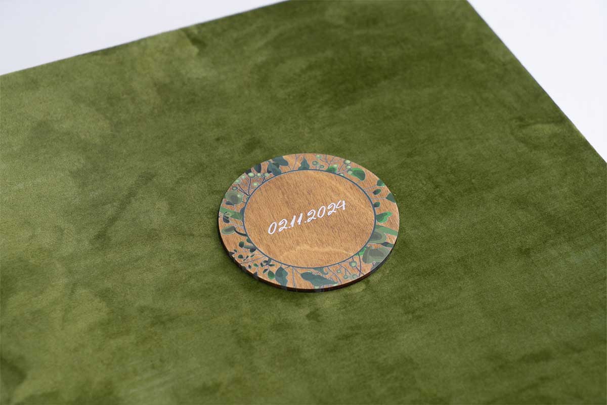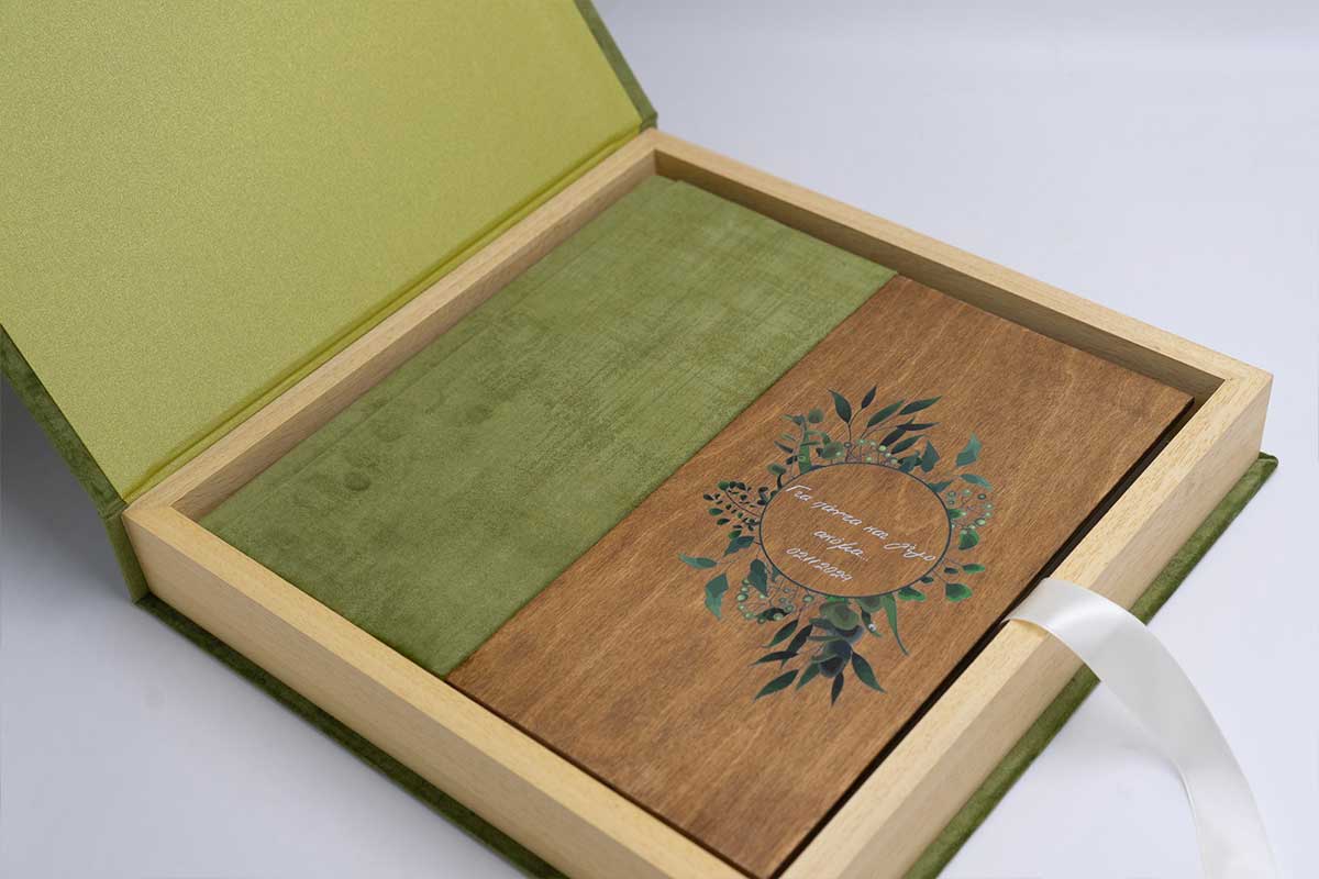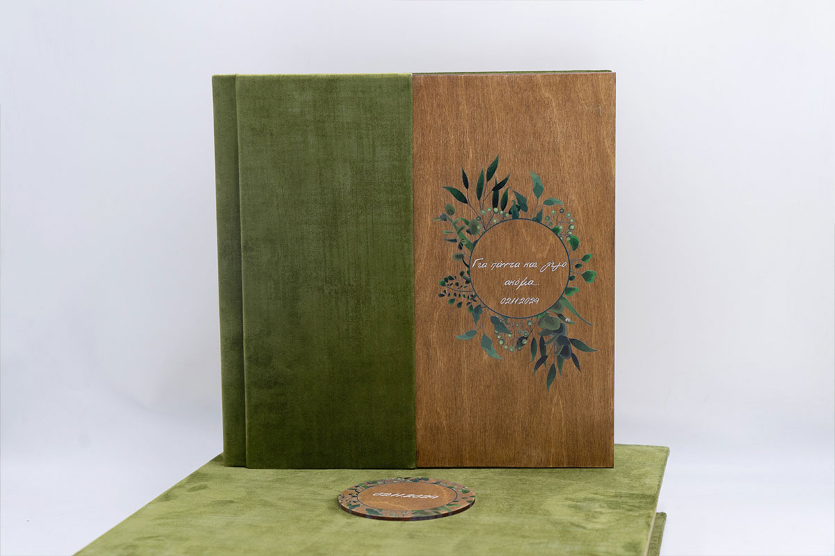 Άλμπουμ γάμου σε διάσταση 30*30. Ένα εντυπωσιακο εξώφυλλο με μισώ ξύλο και βελούδο μετάξι.Στο ξύλο υπάρχει εκτύπωση uv το γραφικο της επιλογής σας.