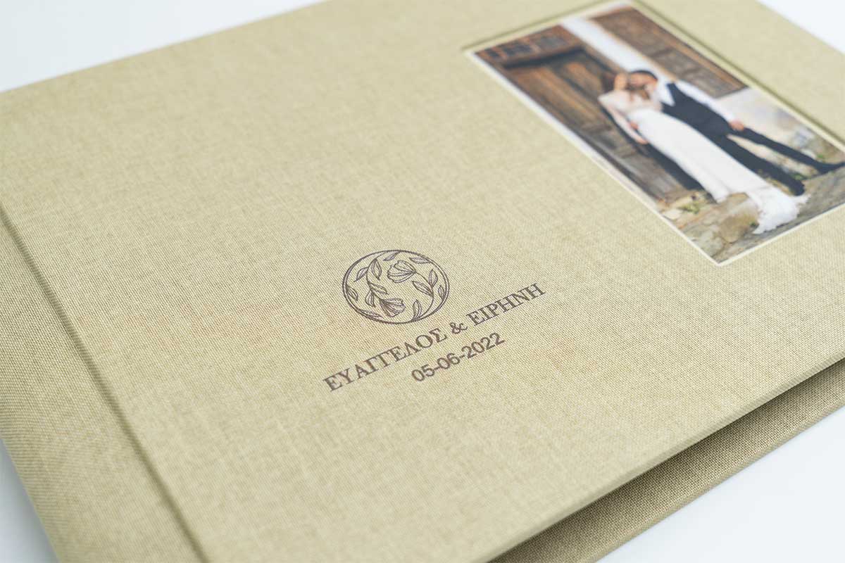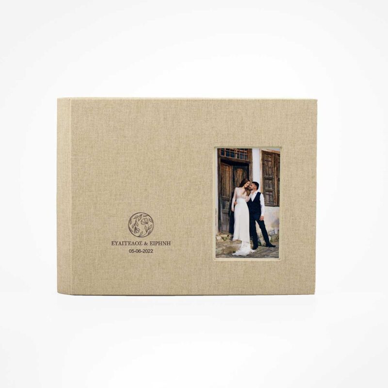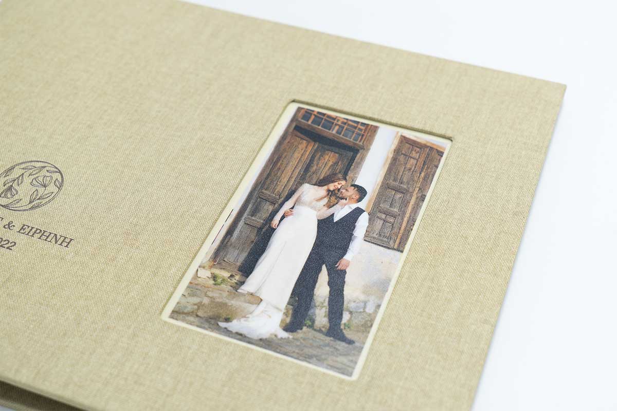 Άλμπουμ γάμου σε διάσταση 30*80 με φωτογραφία παραθύρο κάθετη εκτύπωση uv print το γραφικό της επιλογής σας και ειδικό αδιαβροχοποιημένο λινό ύφασμα.