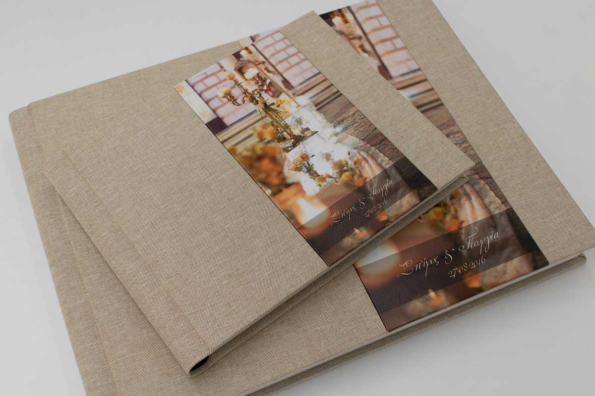 Μία κομψή επιλογή για άλμπουμ γάμου ή βάπτισης με φωτογραφία κάθετη και λινό ύφασμα σε natural απόχρωση.